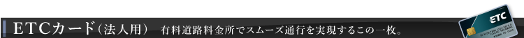 | お申込資格 原則として黒字決算の法人、または個人事業主。 ※ETCカードの同時申し込みが出来ます。(年会費無料、新規発行手数料1,100円(税込)) 年会費 1,375円(税込)/枚 |