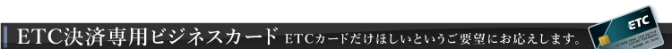 | お申込資格 法人または個人事業主 ※ETCカードは、お食事やショッピング(有料道路のサービスエリア・パーキングエリアの売店を含む)など、通常のクレジットカードとしてはご利用いただけません。 年会費 年会費永年無料 新規発行手数料として1枚につき1,100円(税込)を申し受けます。 メリット ・クレジットカードの管理が不要です。 ・クレジットカードの年会費が削減出来ます。 |